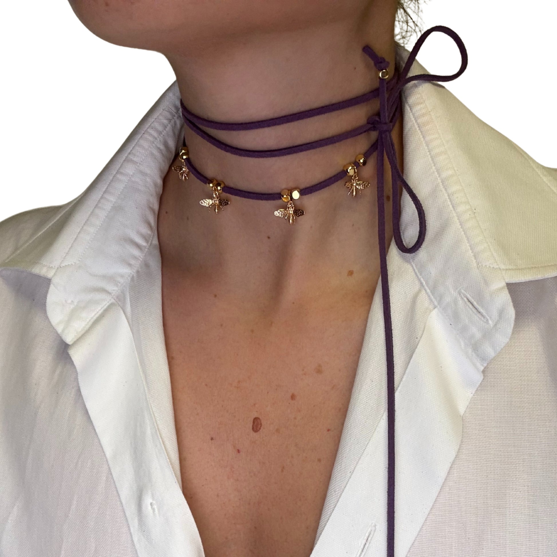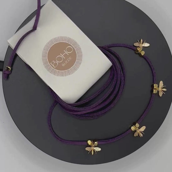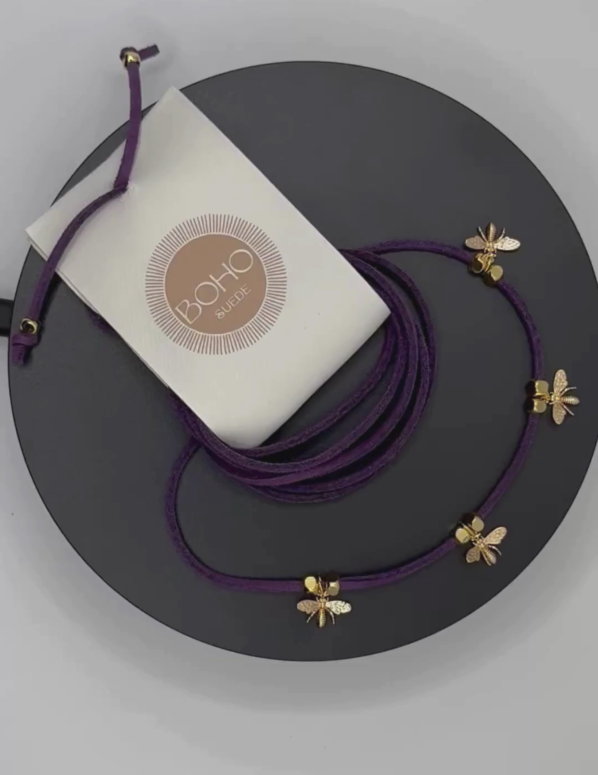 La collana BOHO SUEDE nasce dall’incontro tra pelle scamosciata di alta qualità e ottone placcato oro 18 carati, lavorati con attenzione artigianale per creare un equilibrio perfetto tra morbidezza e luce.