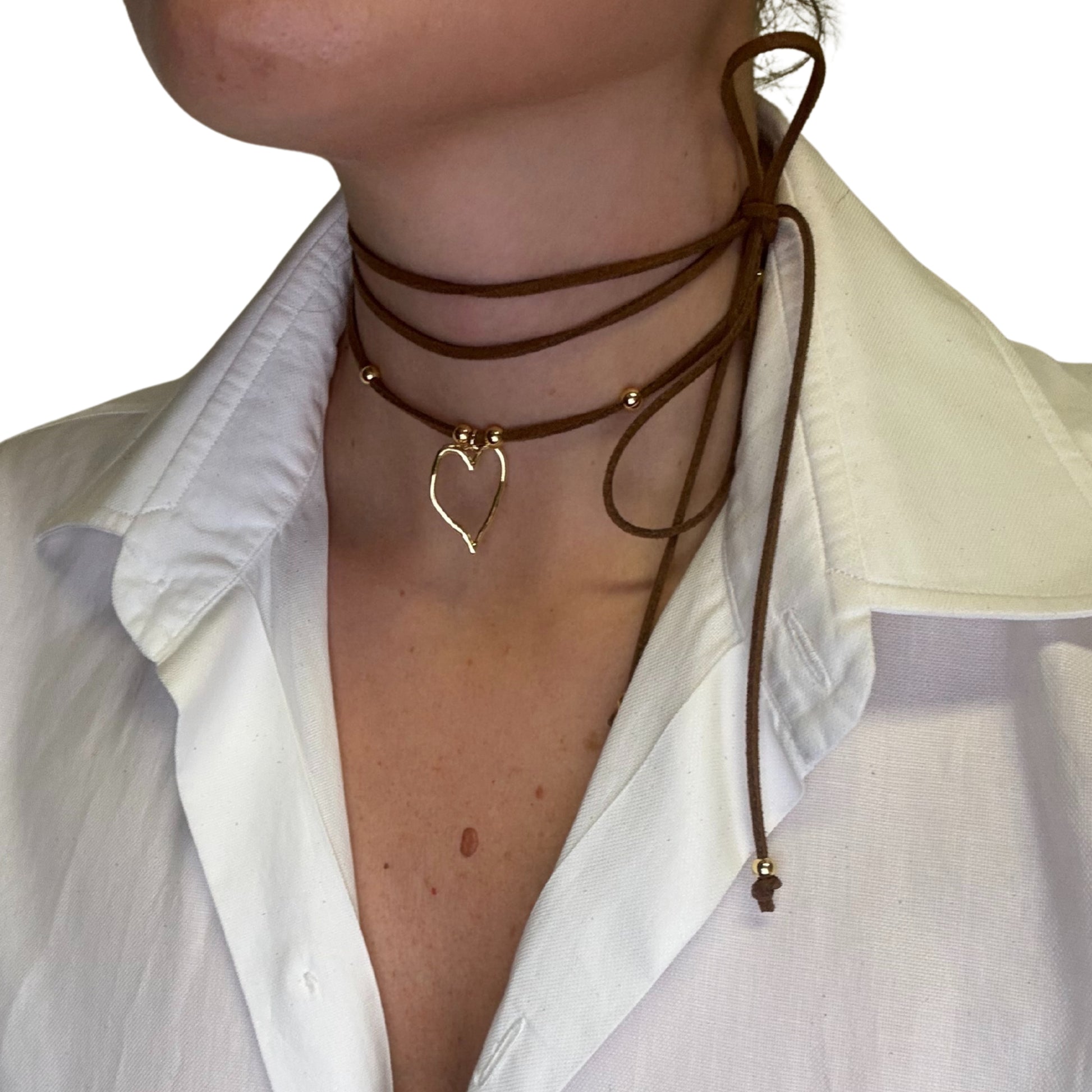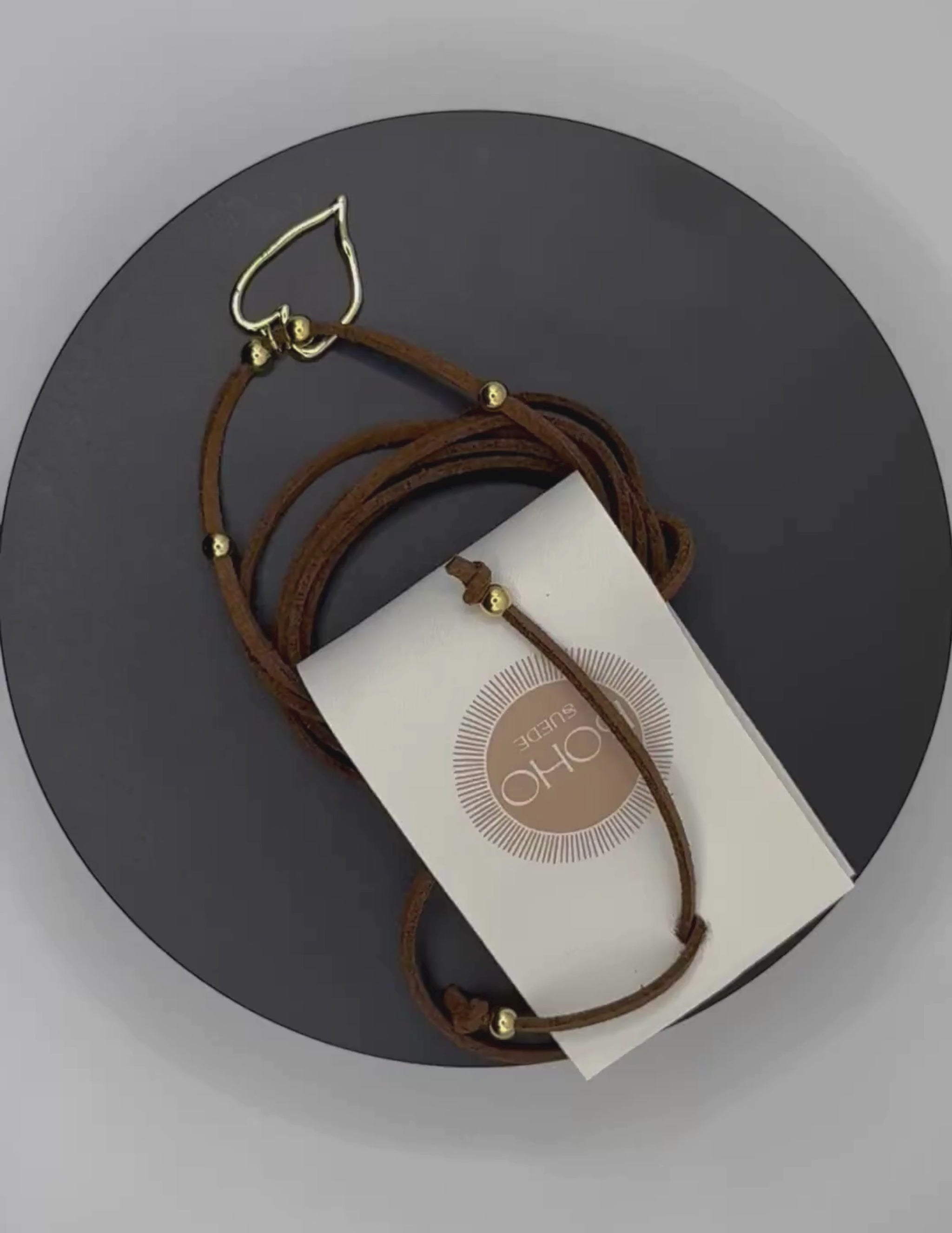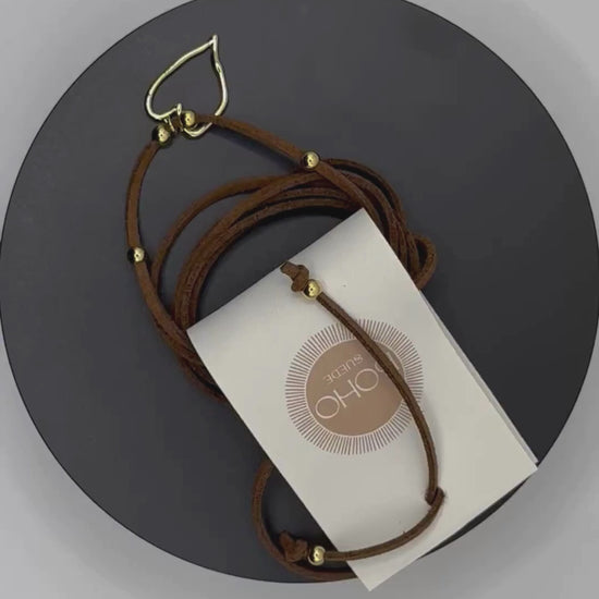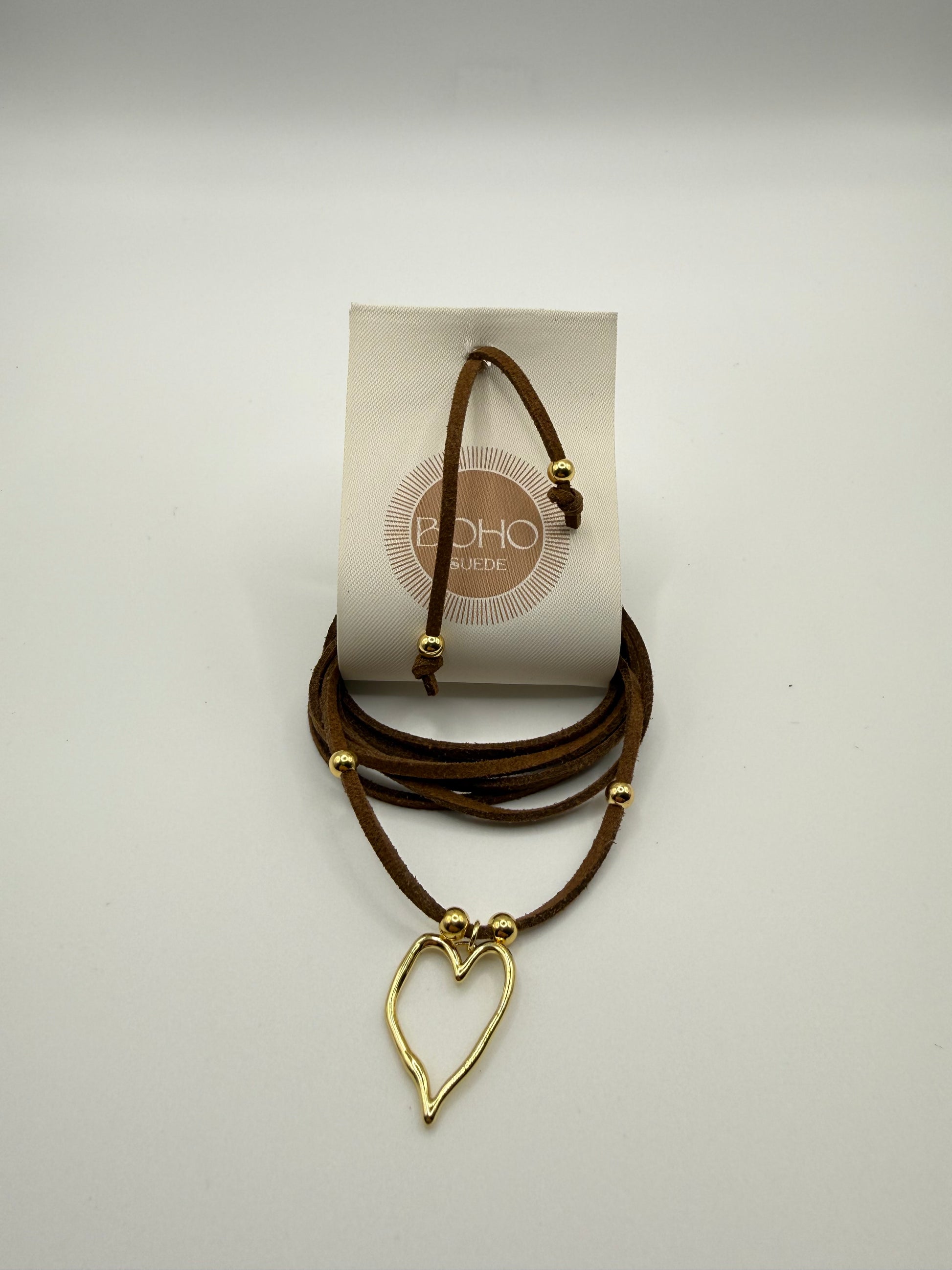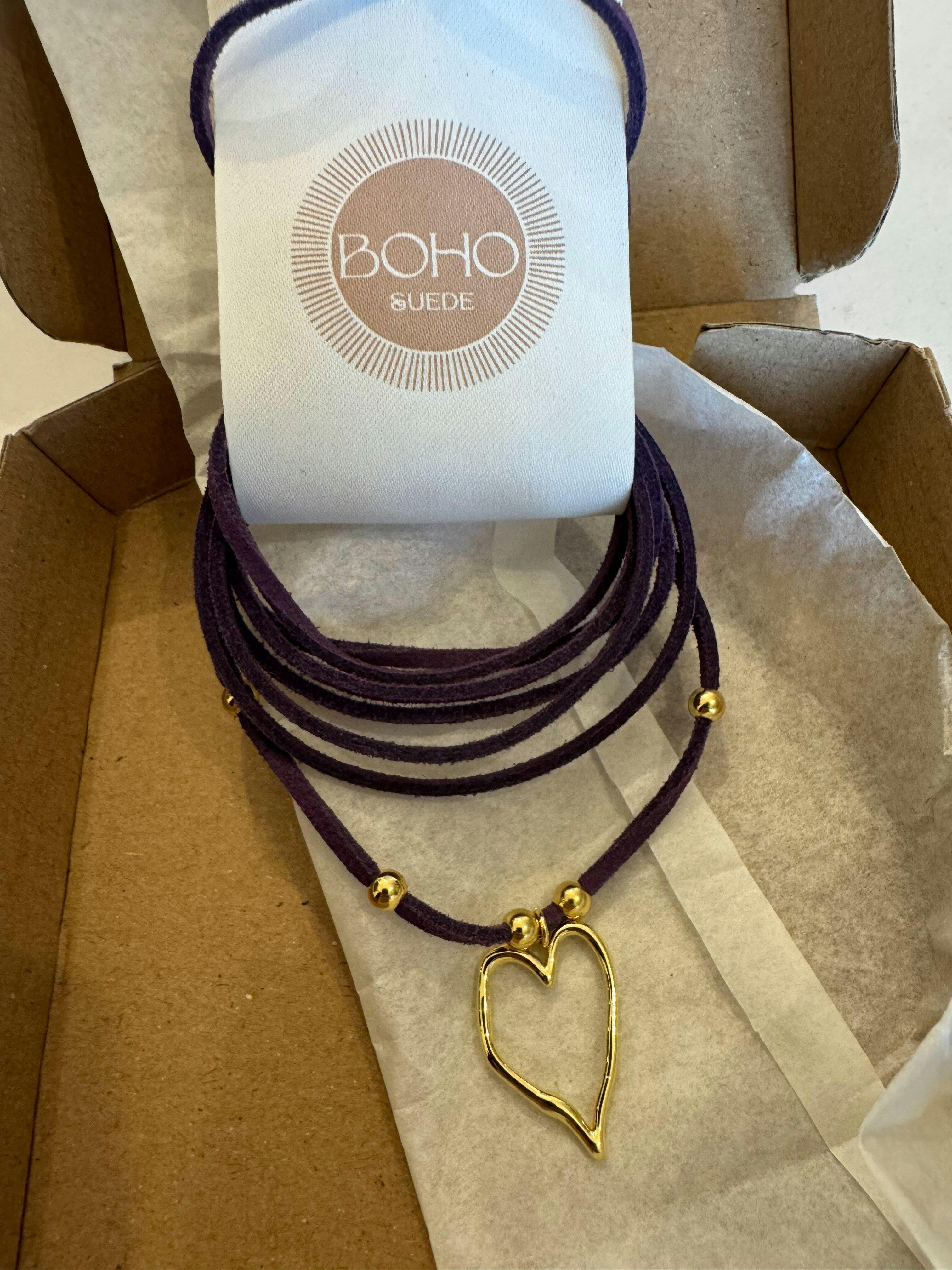 La collana BOHO SUEDE nasce dall’incontro tra pelle scamosciata di alta qualità e ottone placcato oro 18 carati, lavorati con attenzione artigianale per creare un equilibrio perfetto tra morbidezza e luce.
