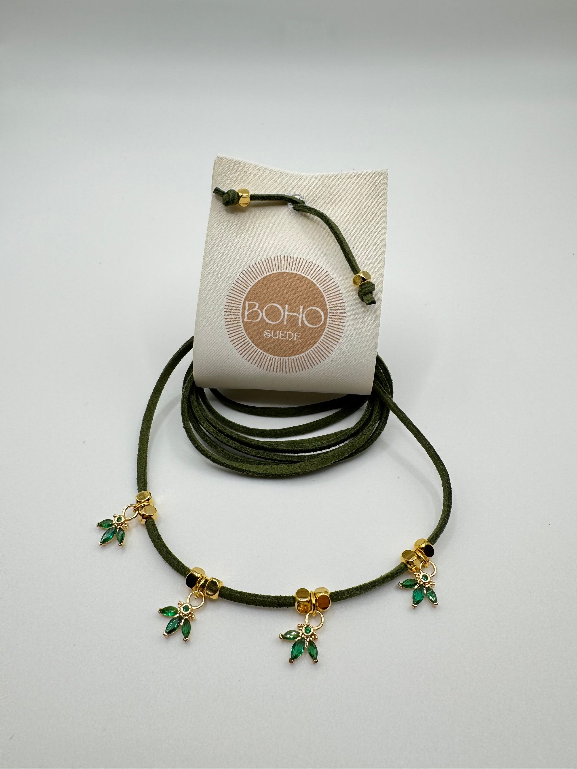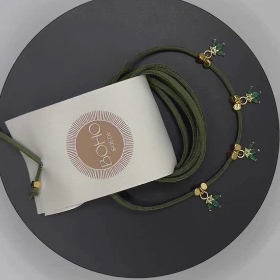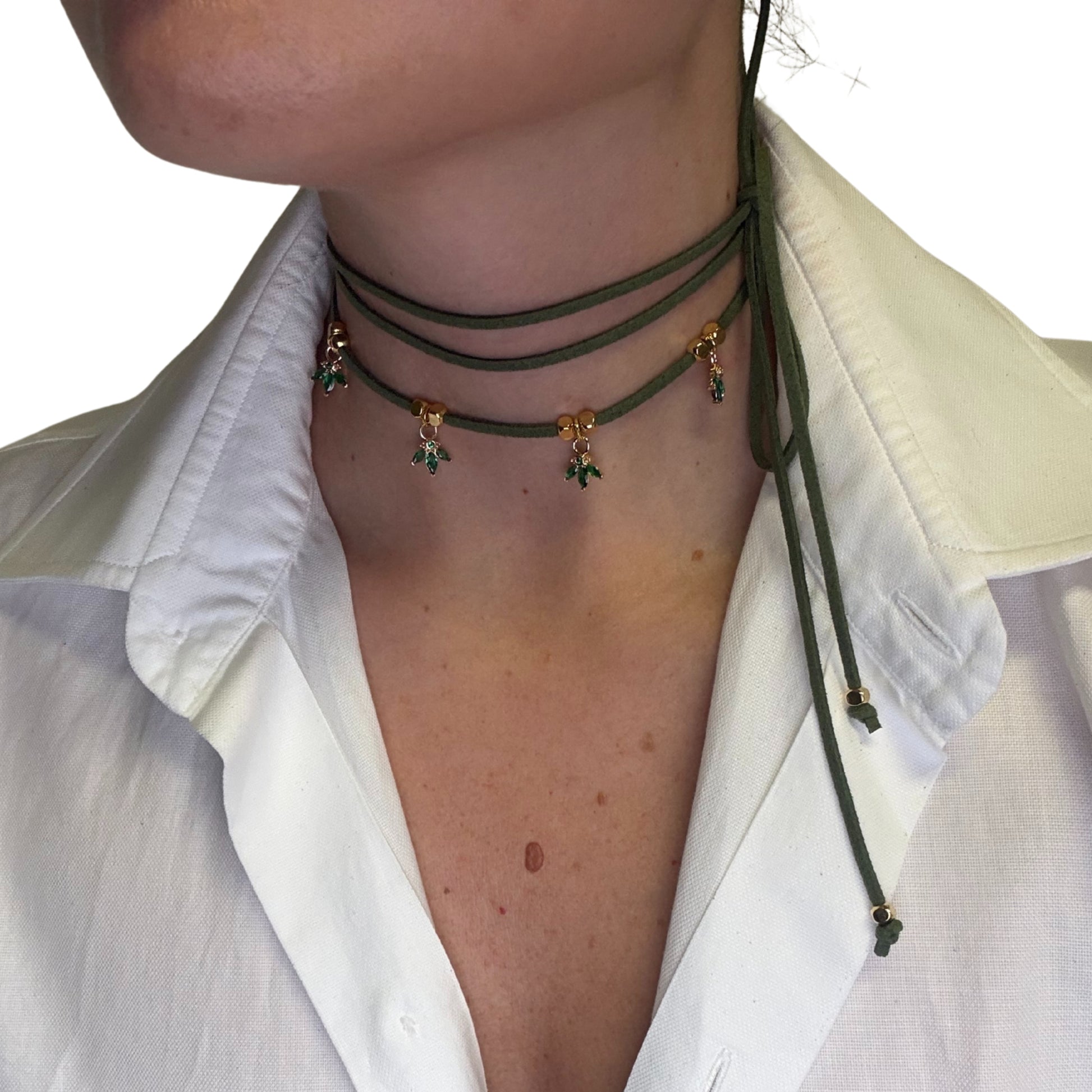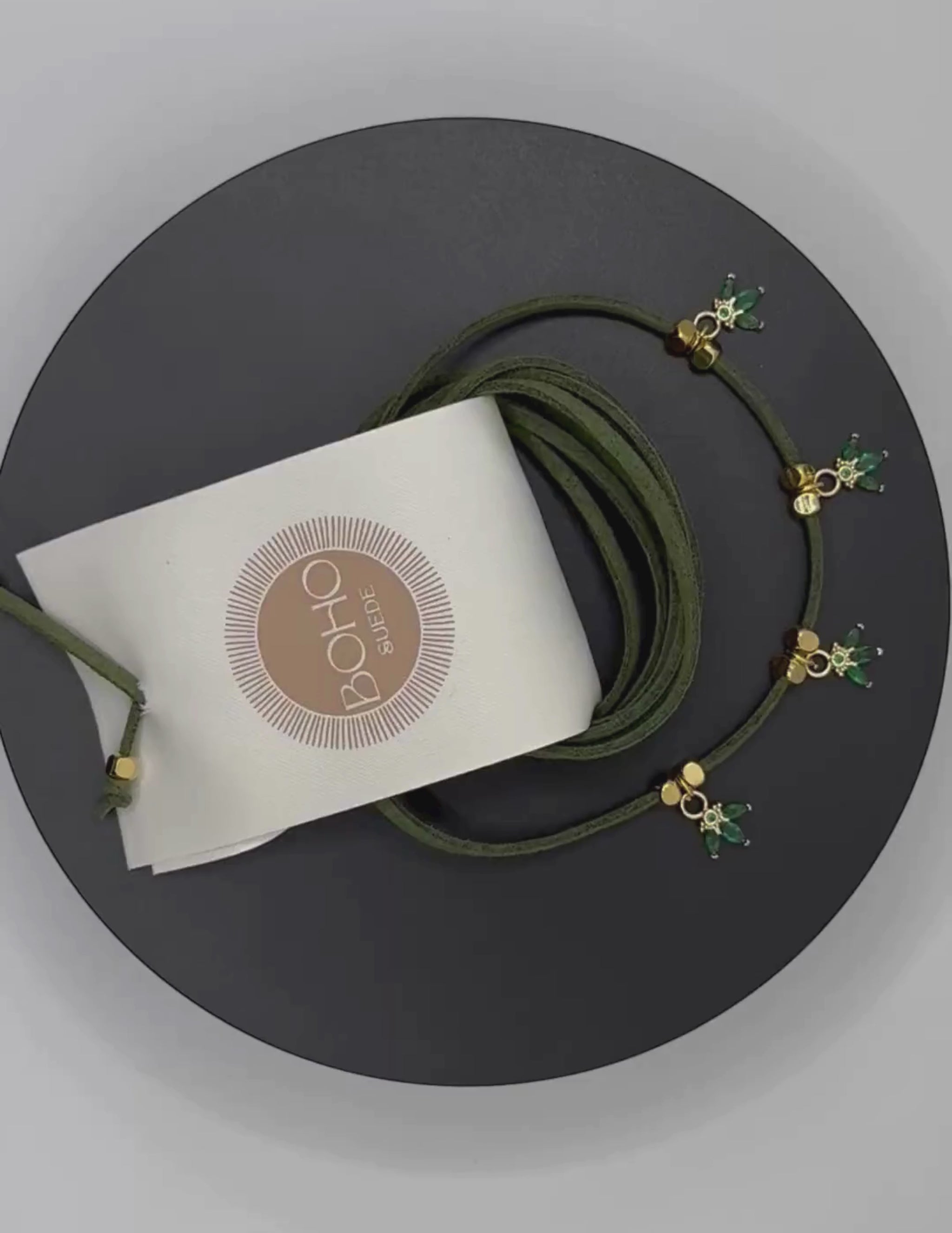 La collana BOHO SUEDE nasce dall’incontro tra pelle scamosciata di alta qualità e ottone placcato oro 18 carati, lavorati con attenzione artigianale per creare un equilibrio perfetto tra morbidezza e luce.